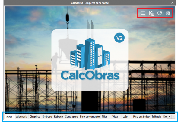 Sempre que o CalcObras for aberto, será apresentada a sua tela inicial como na figura a seguir. Dois espaços interativos estarão disponíveis: os botões de ação, acima (destacado em vermelho) e as abas de serviços, abaixo (destacado em azul).