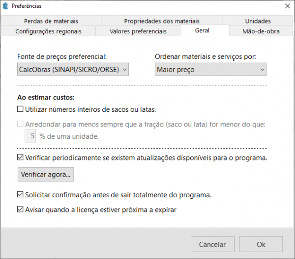 - “Verificar periodicamente se existem atualizações disponíveis para o programa”: marcando esta opção, o CalcObras fará verificações regulares sobre novas atualizações disponíveis para o programa e notificará o usuário;