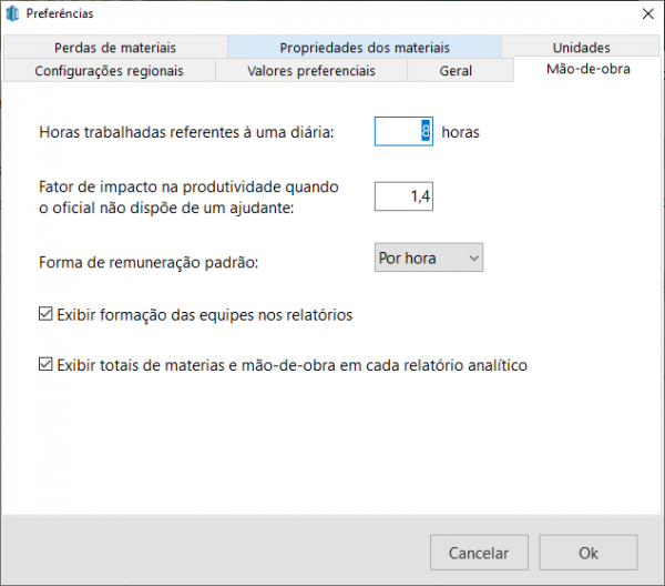 - Exibir totais de materiais e mão-de-obra em cada relatório: quando marcado, o CalcObras irá exibir em cada relatório analítico os valores totais de materiais e mão-de-obra;
