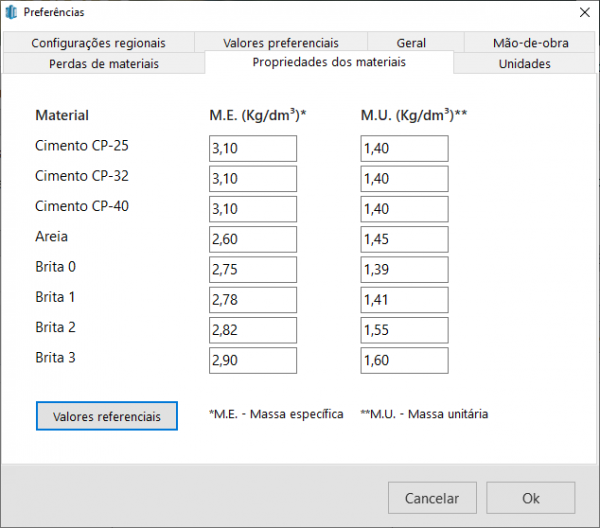 Neste item o usuário pode definir as massas específicas e unitárias para cada material. O CalcObras já vem pré-configurado com valores referenciais (que pode ser carregado através do respectivo botão). Estes valores afetam diretamente no cálculo do consumo de cada material.
