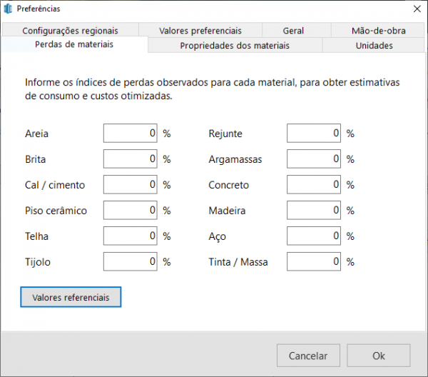 É importante definir os valores dos índices de perdas de materiais (em %) para cada item. Isto vai garantir que as estimativas de consumo e custos sejam mais eficientes. Você pode inserir valores obtidos através de observações pessoais no canteiro de obras (ideal) ou utilizar valores preestabelecidos conforme o perfil de racionalização adotado nos serviços.