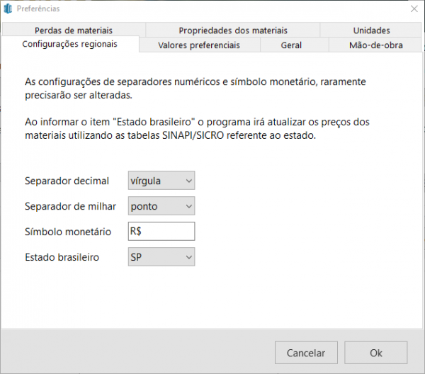 Neste item devem ser informadas configurações preferenciais relacionadas à sua região. O CalcObras já vem configurado para utilização no Brasil. Se este for o caso, as três primeiras opções não necessitam de alteração.