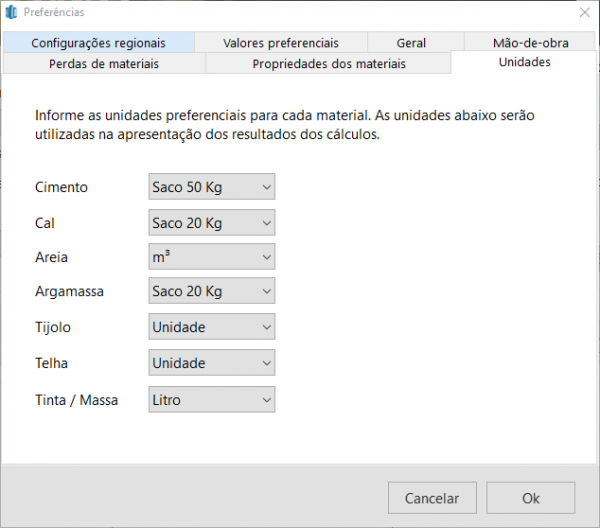 Define como o programa apresentará os resultados dos cálculos do consumo de materiais e estimativas de custos. Configure esta opção com as unidades que você normalmente utiliza ao comprar os respectivos materiais.