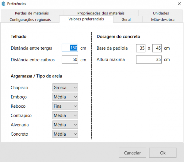 Aqui o usuário pode definir alguns valores e informações que o CalcObras usará como padrão nos cálculos de consumo de materiais.