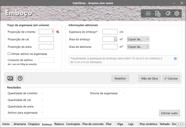 - Espessura do emboço – espessura da camada de argamassa do emboço em centímetros (normalmente de 1,5 a 4,0 cm).