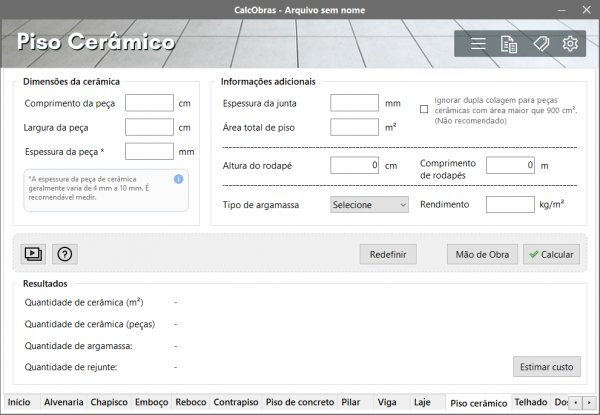 Neste item podemos estimar o consumo de peças cerâmicas, argamassa e rejunte para a execução de assentamento de piso cerâmico.